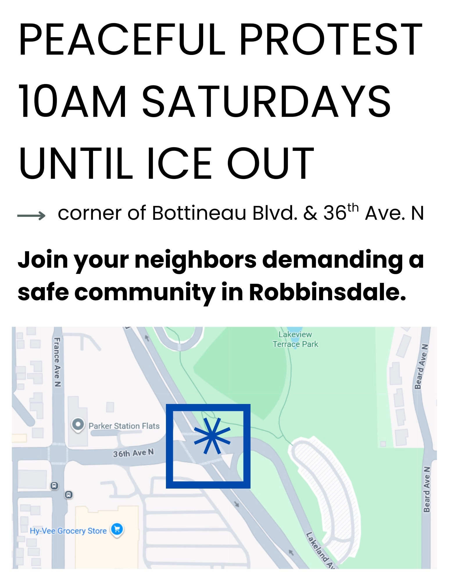 Every Saturday from 10am at the intersections of Bottineau Blvd and 36th Ave N until ICE is out of Minnesota